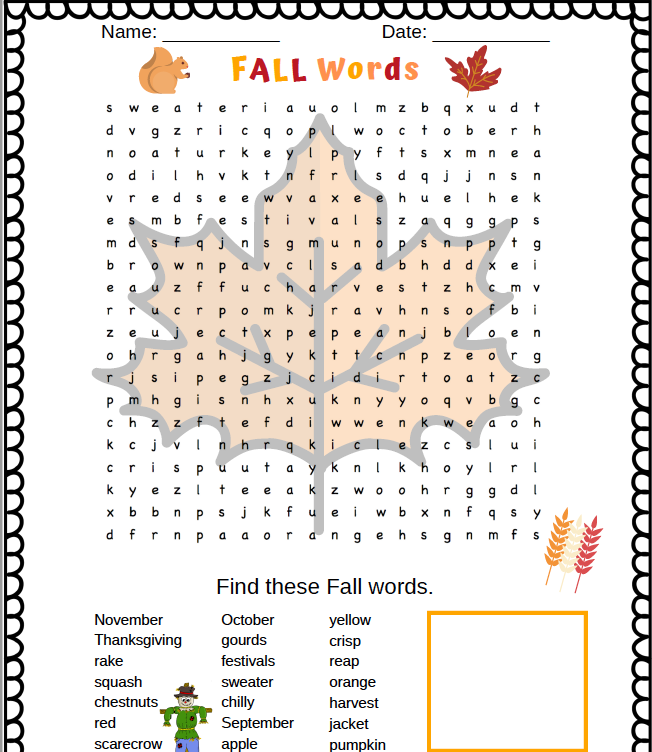 Fall Words - Fun Word Search Puzzle for Grades 2, 3 & 4